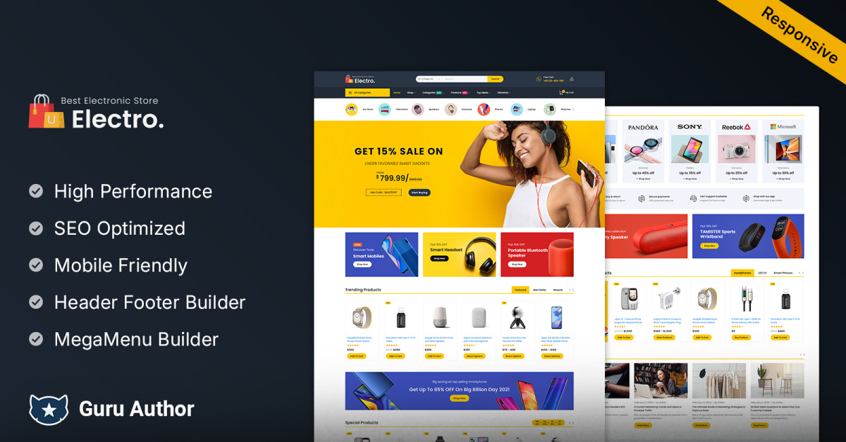 Electro – Mega Shop 多功能 WooCommerce 商店设计/适用于电子、音响系统、相机、小工具、配件、手机、笔记本电脑、电话、VR 设备、智能设备和其他电子商务产品或任何相关网站。这是完全响应式的,因此它完全可以针对各种设备(台式机、笔记本电脑、平板电脑、手机)进行调整,高度可定制的 WooCommerce 主题。使用 Electro WooCommerce 主题构建有效的方式和可持续的电子商务项目,节省您宝贵的时间和金钱。这个 SEO 友好的模板具有许多功能。我们确信它将满足您的所有需求!