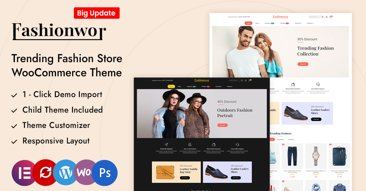 通过 Fashionwor 与领先的 WordPress 页面构建器 Elementor 的无缝集成,释放您的创造力。使用拖放功能轻松自定义您网站的各个方面。Fashionwor 建立在强大的 WooCommerce 平台上,可确保无缝且安全的购物体验。轻松管理您的产品、库存和订单,同时为您的客户提供从浏览到结账的顺畅而直观的购物体验。