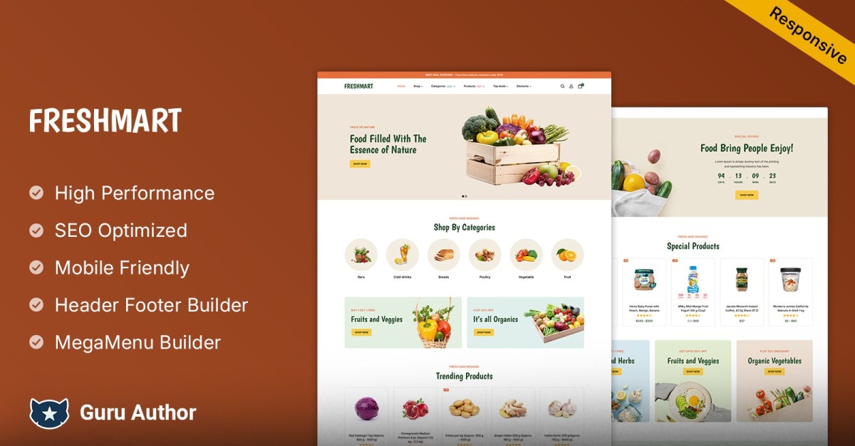 首先也是最重要的是,FreshMart 拥有令人惊叹的时尚设计,从您的客户登陆您网站的那一刻起就会吸引他们。其完美融合了现代美学和直观的用户界面,确保轻松导航,增强整体购物体验。凭借干净整洁的布局,您的产品占据中心舞台,吸引访客进一步探索您的商店。