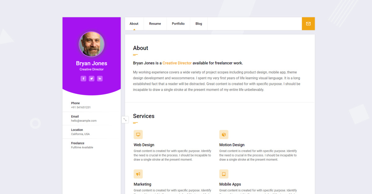 Bryan 是为摄影师、设计师、开发人员、创意人员、艺术家、画家等设计的简历/简历/作品集/个人 WordPress 主题。主题演示是使用最流行的拖放页面生成器构建的