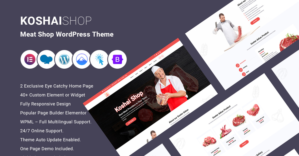 Koshai Shop 是一款独特的现代 WordPress 主题,它是使用最流行的页面构建器 Elementor 和 Wp-bakery 开发的。如果有人愿意,他们可以使用 Elementor 或 wp-bakery 页面构建器。该主题是为那些正在寻找 Meat Shop WordPress 主题的人开发的。如果有人想开一家肉店,这个主题可以成为他们的得力助手。由于我们使用了两个页面构建器 Elementor 和 Wp-bakery,因此用户可以使用其中任何一个。该网站开发了 40 多个自定义小部件。主题中添加了 Woocommerce,添加了产品比较和愿望清单。要使用该主题,用户不需要任何编码知识。该主题设计简洁醒目。只需在网站上使用拖放构建器,任何人都可以使用它。