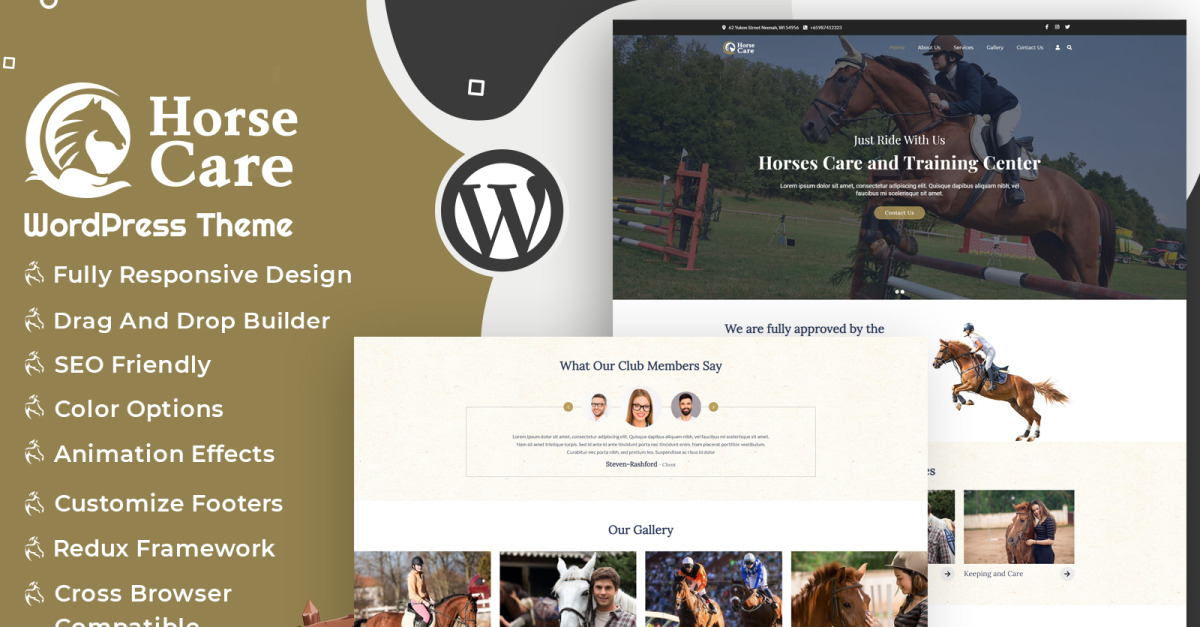 Horses Care 是一个令人愉快且轻量级的 WordPress 主题,适用于有关马匹、种马场和马厩的网站。该主题非常适合种马场、马厩、马匹护理、骑马、马术、养牛场、奶牛场、马匹造型、马匹繁育、动物护理和其他类似业务。 Horse Care 提供独一无二的用户体验。它在所有屏幕和平台上看起来都很棒,包括 Windows、Mac、iOS、Android 等。