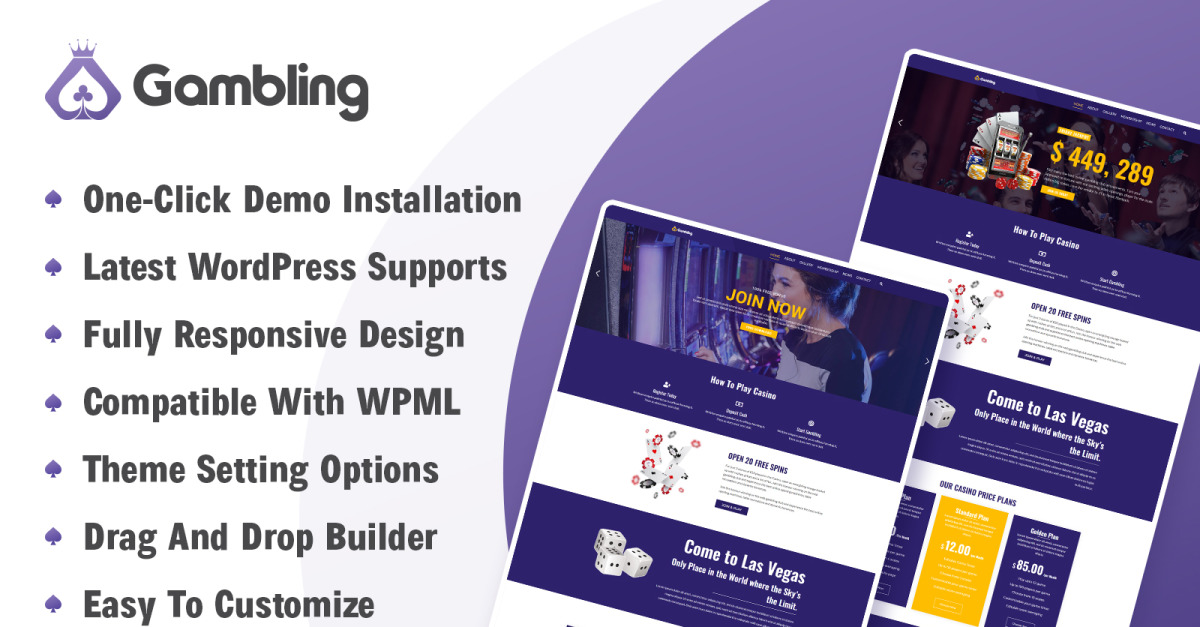 赌博 - 赌场和赌博 WordPress 主题旨在为您的在线赌场和赌博业务带来全新和引人入胜的外观。如果您经营扑克、赌博、彩票、赌场、体育博彩,那么这个主题是您业务的经济高效且独特的解决方案。