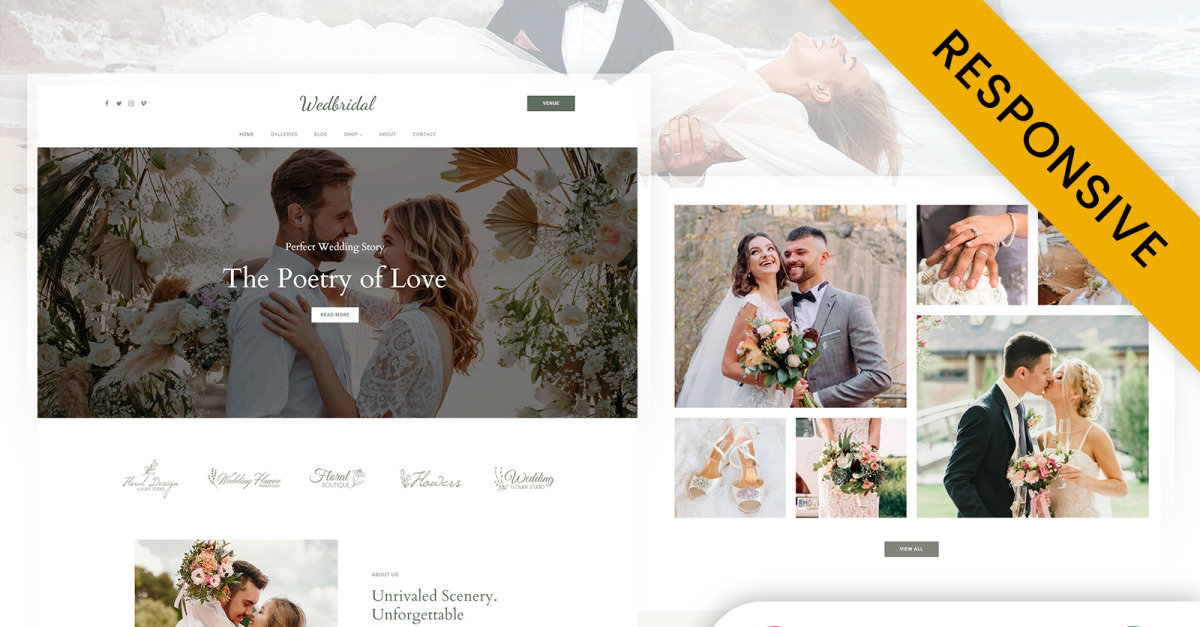 主页部分包含关于您的工作室和所提供服务的引人入胜且信息丰富的版块。主题已包含足够的内容块和示例数据。您只需将其替换为商店相关数据即可。Wedbridal 已进行 SEO 优化,并响应各种屏幕尺寸,可轻松适应各种设备,并兼容主流浏览器。