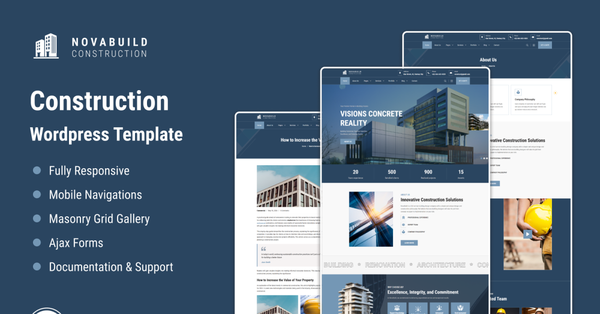 Novabuild 是一款功能强大、用途明确的 WordPress 模板,专为建筑行业和企业客户设计。无论您经营的是建筑公司、建筑工作室还是工程咨询公司,Novabuild 都能提供精致、现代的外观和高级功能,让您轻松展示项目、突出服务,并展示您的团队的风格和专业精神。