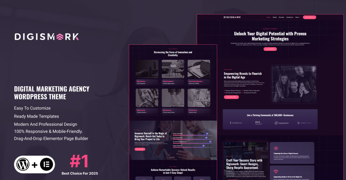 Digismark 是一款现代、时尚、高性能的 WordPress 主题,专为数字营销机构、SEO 专家、初创公司、自由职业者和商业顾问而设计。该主题使用Elementor构建,提供拖放式自定义功能,让网站创建变得轻松无比 — 无需编码!