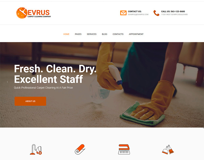 Evrus - 住宅和商业地毯清洁服务 WordPress 主题。