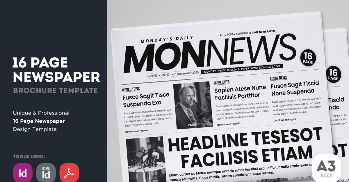16 page Newspaper Design Template for various purposes, such as News Agnecy, Journalism, Daily News, Weekly News, Print Media, Electronic Media, Corporate, Multipurpose, etc. It's a unique and clean layout that also can use for other professional works.