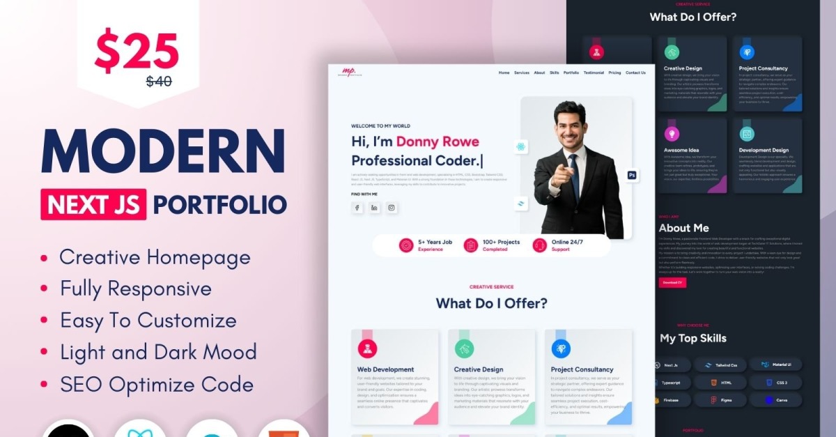Added Light and Dark Mode for theme switching. Added a new Pricing Section to display service plans. Changed Testimonial Section layout and design for better user experience. Removed Material UI and replaced it with a Tailwind CSS theme. Created a Theme System for color management. Created a Config File to store and manage all data like images, icons, and services (/components/config.tsx). Optimized and finalized the template for improved performance.