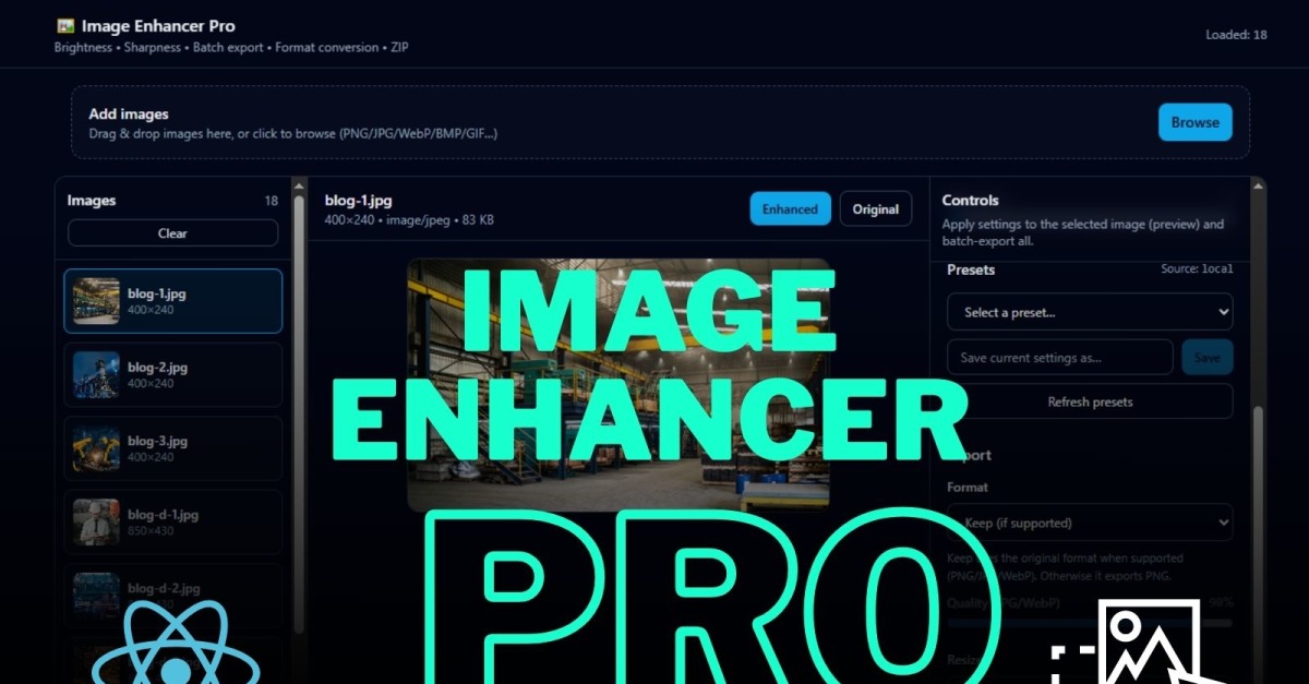React Image Enhancer Pro || kontrast, sytost, změna velikosti