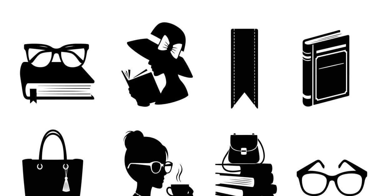 Černé siluety lidí čtoucí knihy v různých pózách a prostředích izolovaných na bílém pozadí 8 € Download