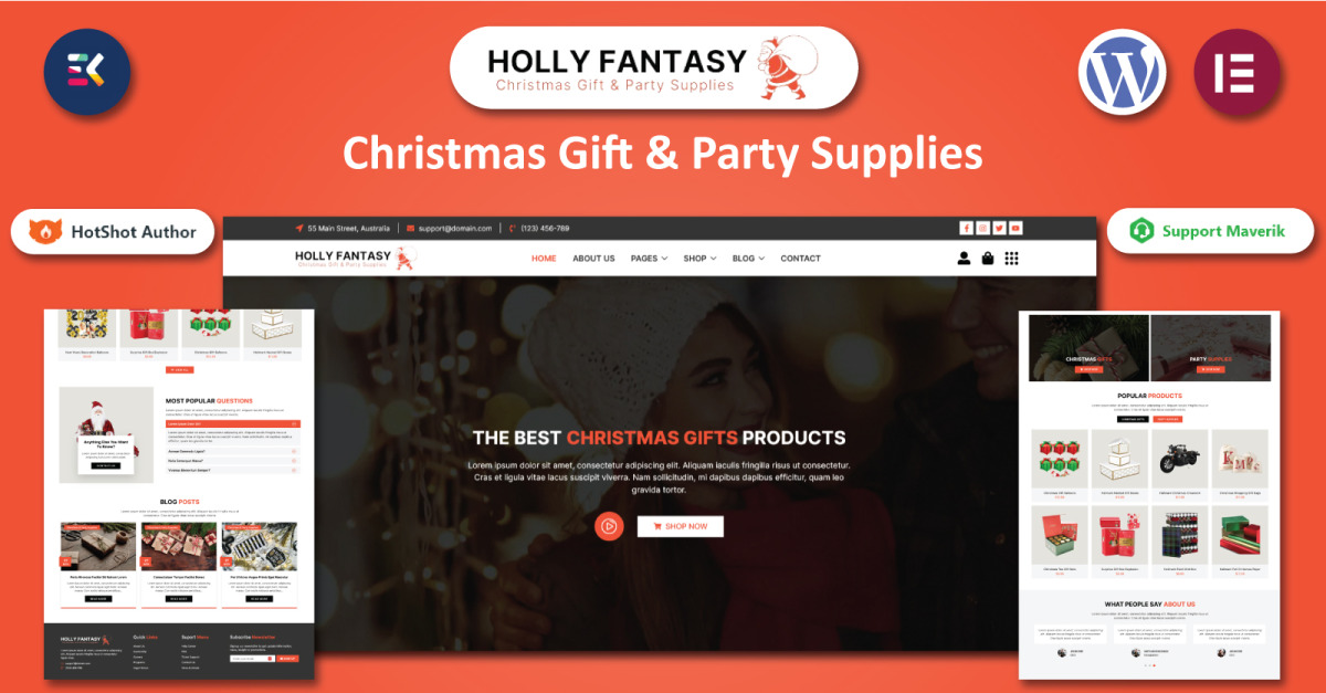 Holly Fantasy - velikonoční, vánoční dárky a novoroční párty potřeby WordPress šablona Elementor