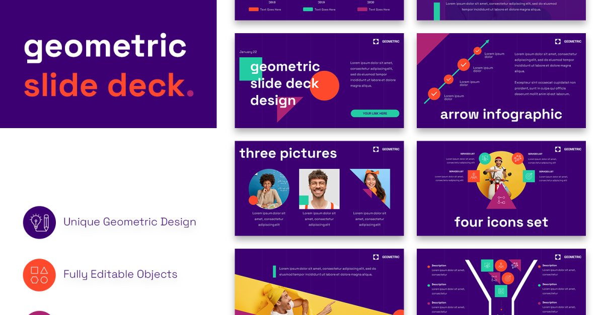 Das Erstellen Ihrer Folien von Grund auf war noch nie so einfach. Mit der geometrischen Präsentationsvorlage von Google Slides können Sie jetzt in nur wenigen Minuten ein leistungsstarkes und professionelles Deck mit modernem Design erstellen. Wenn Sie sich für unser Produkt entscheiden, erhalten Sie eine beeindruckende und einfach zu bearbeitende Vorlage mit kostenlosen Updates und Support.