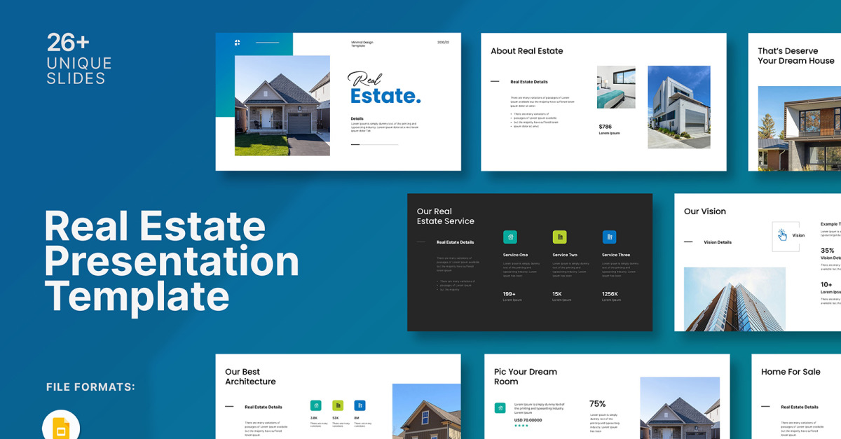 Mit der Google Slide-Präsentationsvorlage für Immobilien können Sie Ihr Logo und Bilder hinzufügen sowie Ihre Markenfarben und Typografie bearbeiten. Und schon kann es losgehen. Bitte verschwenden Sie keine Zeit, wir haben die ganze harte Arbeit für Sie erledigt.