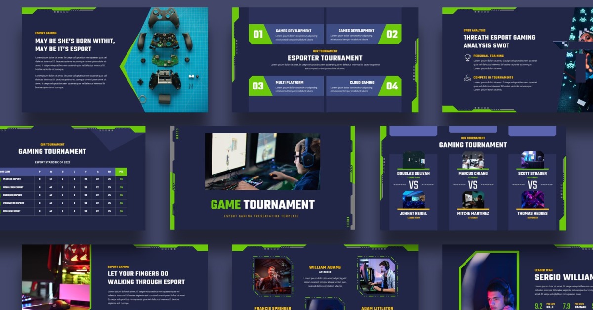 Die Gaming-Präsentationsvorlage bietet ein dynamisches und modernes Design, ideal für die Präsentation von E-Sport-Events, Gaming-Teams und Turnieren.