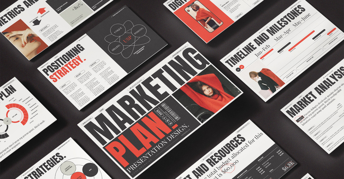 Die Marketingplan-Präsentation besteht aus 16 vollständig anpassbaren Layout-Designvorlagen für Google Slides.