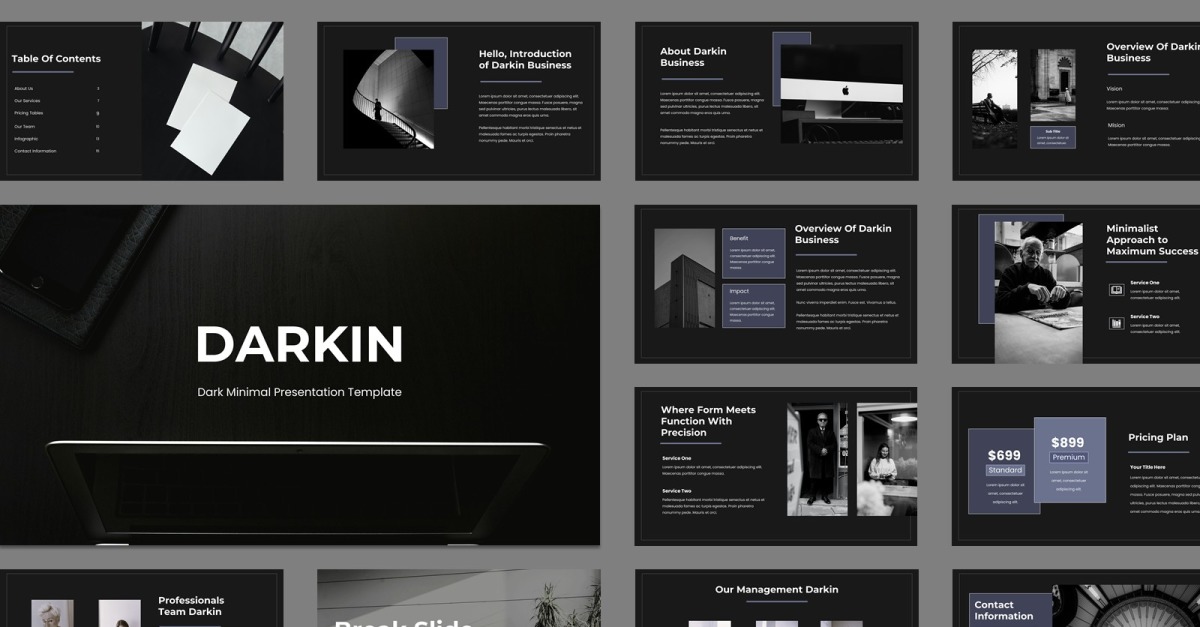 Darkin - Business Dark Theme Keynote ist intuitiv und stilvoll gestaltet. Es enthält verschiedene Infografiken wie Balkendiagramme, Kreisdiagramme, Liniendiagramme und mehr und ist somit eine vielseitige Lösung für jede Präsentation.