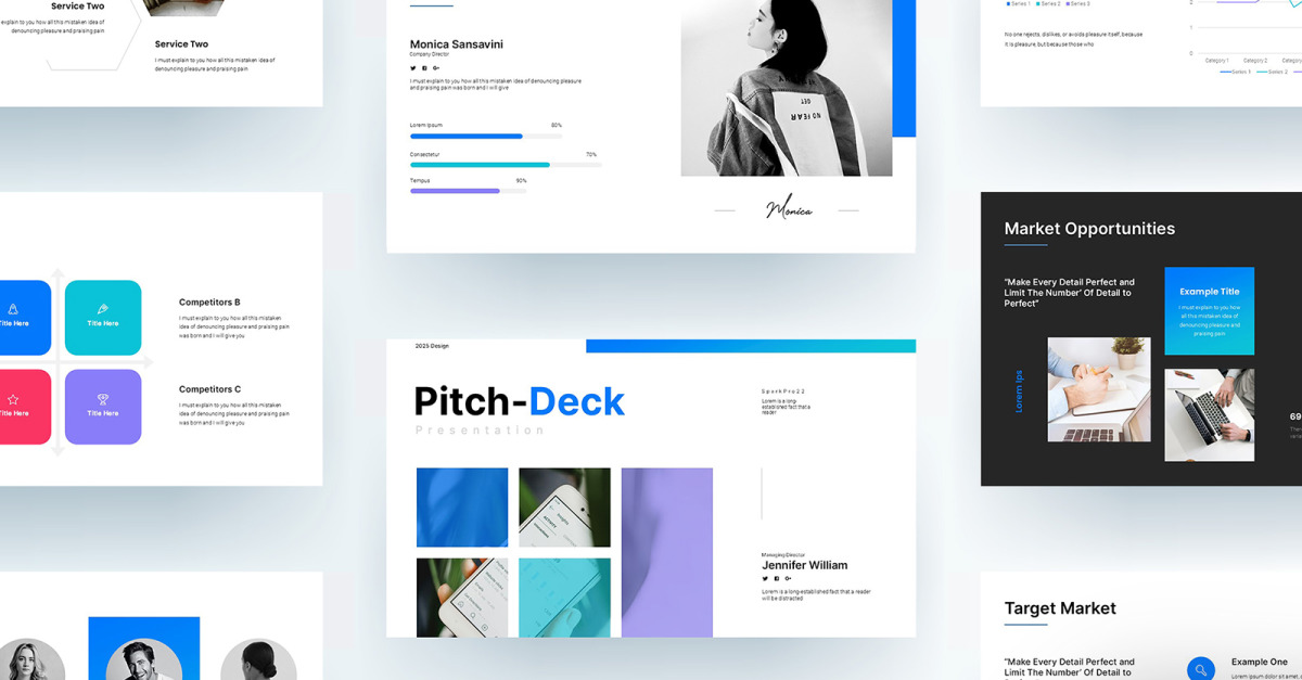 Exportieren und als PDF oder PPTX an Kunden senden. Typografie und Markenfarben lassen sich ganz einfach durch Ihre eigenen ersetzen.