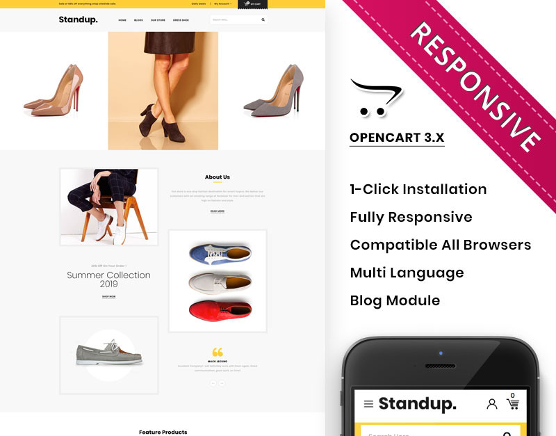 Standup – The Ultimate Shoe Shop ist eine Premium-Responsive-Vorlage von OpenCart, die für E-Commerce-Shops entwickelt wurde, die auf Schuhe, Ledertaschen, Accessoires und Modeartikel für Männer und Frauen spezialisiert sind. Es bietet ein schlankes und modernes Design mit umfangreichen Anpassungsmöglichkeiten.
