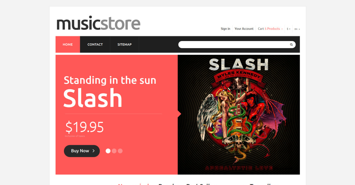 Wir glauben, dass dieses Musikgeschäft mit seinem ungewöhnlichen Design und Farbgebung zum Erfolg verdammt ist. Aber das Wichtigste zuerst. Das erstaunlichste Element auf der Seite ist ein riesiger Slider, der aus zwei Teilen - Bildern und Texten - besteht. Die Kombination aus rosa und schwarzen Farben zieht wie ein Magnet die Besucher an. Dazu verfügt das Theme über eine extrem benutzerfreundliche Navigation. Außer dem Hauptmenü und dem Footer können die Kunden nach Ihrer Lieblingsmusik unter den Kategorien in der linken Seitenleiste oder unter meistverkauften Artikel in der rechten Seitenleiste suchen. Empfohlene Produkte sind in zwei Spalten angeordnet. Wir hoffen, dass Sie diese Vorlage genauso sehr wie wir mögen und für Ihren zukünftigen Online-Shop in Betracht ziehen werden.