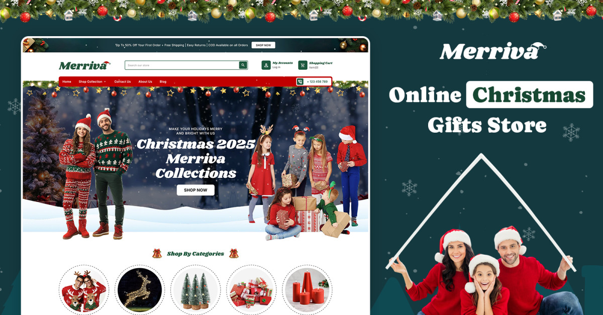 Merriva ist ein wunderschön gestaltetes, responsives Shopify-Theme für Weihnachten, das Ihrem Onlineshop festlichen Charme und hohe Performance verleiht. Dank des leistungsstarken Redux Frameworks und des Live-Customizers können Sie Farben, Layouts und Schriftarten in Echtzeit anpassen. Mit dem Ein-Klick-Demo-Import, vorgefertigten Startseiten und unbegrenzten Anpassungsmöglichkeiten wird die Einrichtung Ihres Onlineshops zum Kinderspiel. Merriva ist vollständig Shopify-kompatibel, basiert auf Bootstrap und ist 100 % responsiv – so sieht Ihr Shop auf allen modernen Browsern und Geräten perfekt aus. Es bietet ein funktionierendes Ajax-Kontaktformular, ein minimalistisches und klares Design, Material Icons, kostenlose Google Fonts und eine CSS3-Tabellenstruktur für schnelles Laden und reibungslose Performance. Das Theme unterstützt mehrere Sprachen, enthält gut kommentierte Dateien, eine ausführliche Dokumentation, kostenlose Updates und Kundensupport rund um die Uhr. Mit seinem eleganten Design, den modernen Funktionen und dem festlichen Stil bietet Merriva ein außergewöhnliches Weihnachtseinkaufserlebnis, das Ihrem Onlineshop zum Erfolg verhilft.
