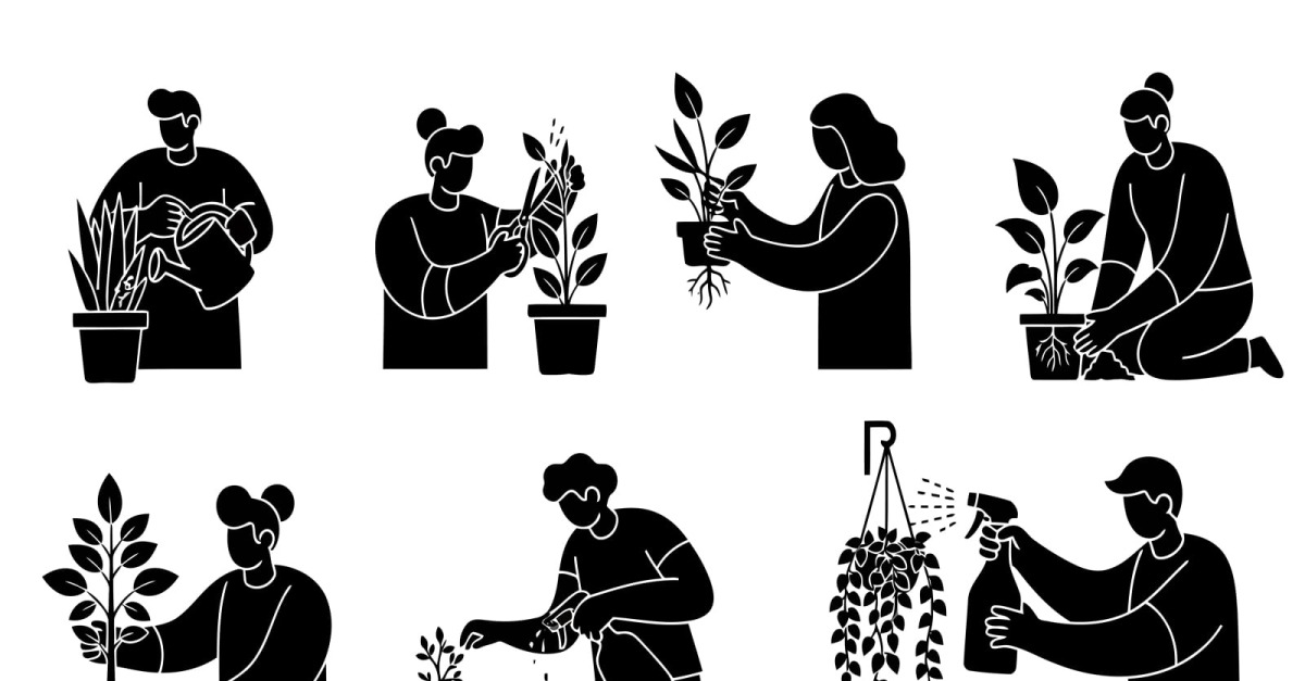Silhouette von Gärtnern bei der Arbeit mit Pflanzen, isoliert auf weißem Hintergrund 8 € Herunterladen