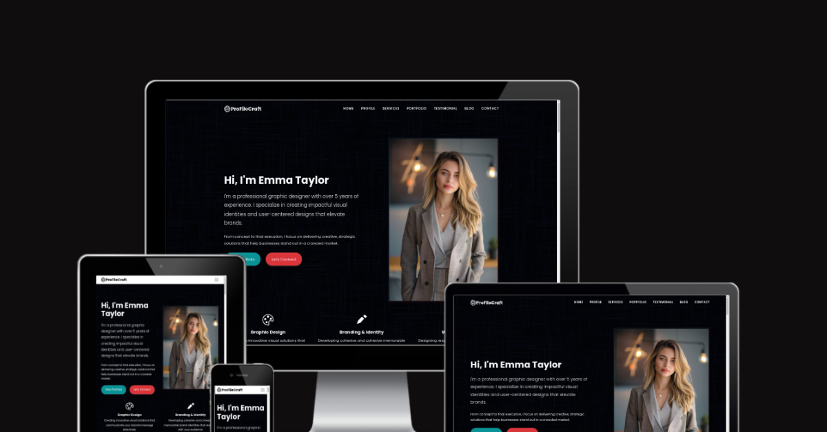Die ProFileCraft-Vorlage ist eine vielseitige HTML-Vorlage mit mehreren Versionen für Berufstätige, die ihren Lebenslauf, ihr Portfolio oder ihre Dienstleistungen online präsentieren möchten. Sie wurde mit sauberem HTML, CSS und Bootstrap 5 erstellt und bietet drei verschiedene Versionen, die auf unterschiedliche Berufsfelder zugeschnitten sind: