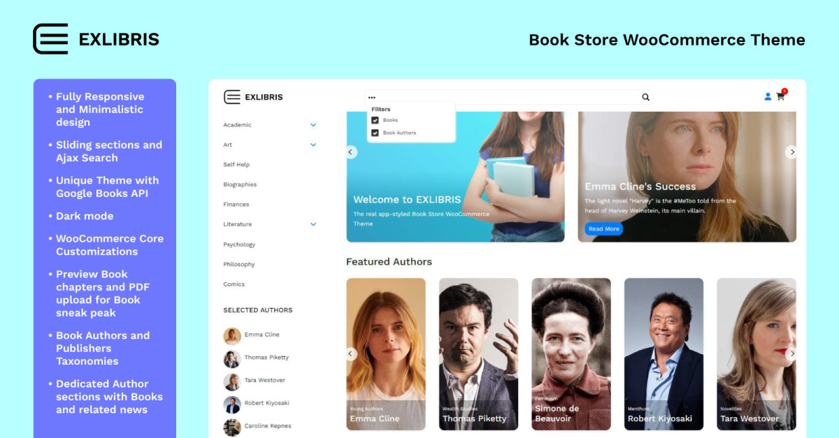 EXLIBRIS ist ein minimalistisches, app-artiges, rationelles und funktionales WooCommerce-Theme für WordPress, erstellt mit Bootstrap und Advanced Custom Fields (ACF) Pro. Es eignet sich ideal für Online-Buchhandlungen, Verlage oder als Ergänzung zum Ladengeschäft, die eine moderne und einfach zu konfigurierende Lösung suchen, die gleichzeitig optisch ansprechend und mit einzigartigem Design überzeugt. Es ist derzeit das einzige Theme auf dem Markt, das die Google Books API integriert und sich als zunehmend einzigartiges Produkt etabliert hat.