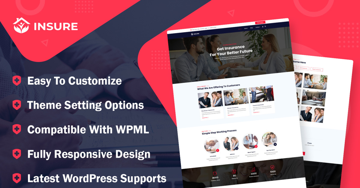 Insure ist eine ideale Website für Versicherungs- oder Finanzagenturen, da sie nützliche Funktionen wie Agentensuche, Versicherungsprodukte und Angebotsanfrage bietet. Das Theme eignet sich hervorragend für Unternehmensberatungen, Versicherungsgesellschaften, Versicherungsagenten, unabhängige Agenturen und Handelsunternehmen. Das professionelle Layout lässt sich mit dem WPBakery Page Builder individuell anpassen und ermöglicht Ihnen die Erstellung Ihrer eigenen Website.