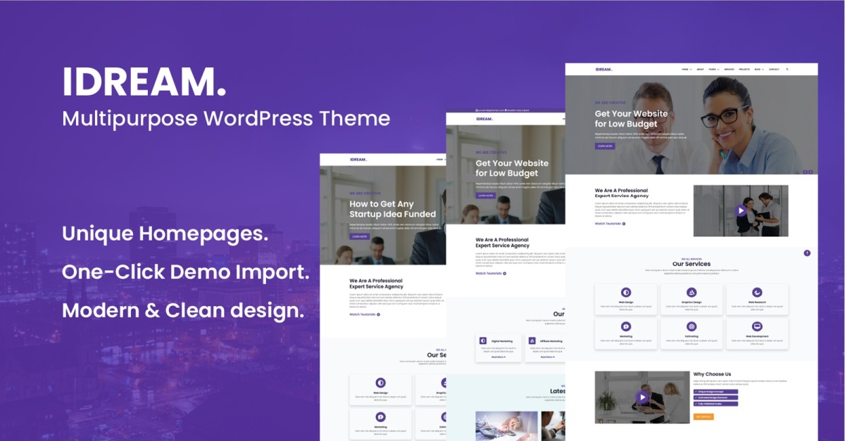Idream ist das schöne WordPress-Theme. Wenn Sie eine schöne Website für Ihr Unternehmen oder einen anderen Zweck erstellen möchten, können Sie sich für Idream entscheiden. Idream ist vollständig kompatibel mit Mobilgeräten oder anderen Geräten. Dieses Thema unterstützt viele beliebte Plugins wie Contact Form 7. Außerdem können Benutzer Ihre Website mit One Click Demo Importer einrichten.