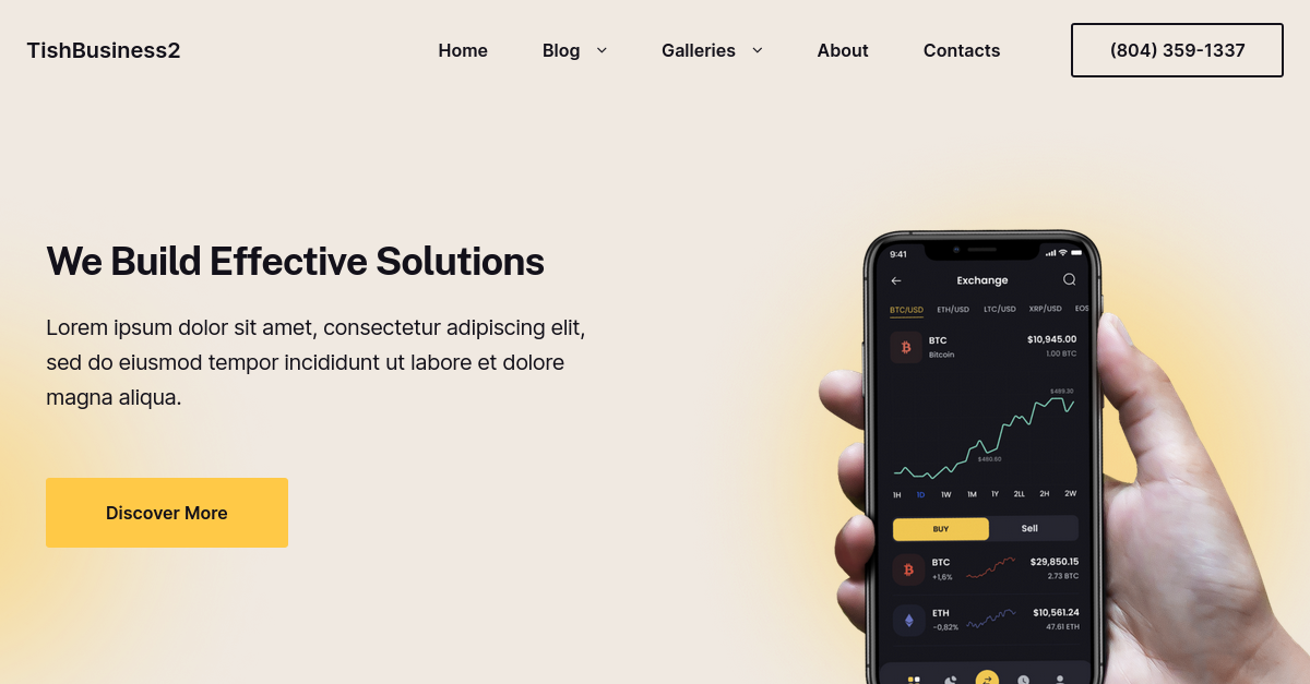TishBusiness2 wird mit einem Homepage-Banner für Business-Landing-Inhalte geliefert: rechtes Bild, Titel, Text und die Schaltfläche „Mehr entdecken“, die für den Abschnitt „Homepage-Banner“ des Admin-Panels/Customizer angepasst werden kann.