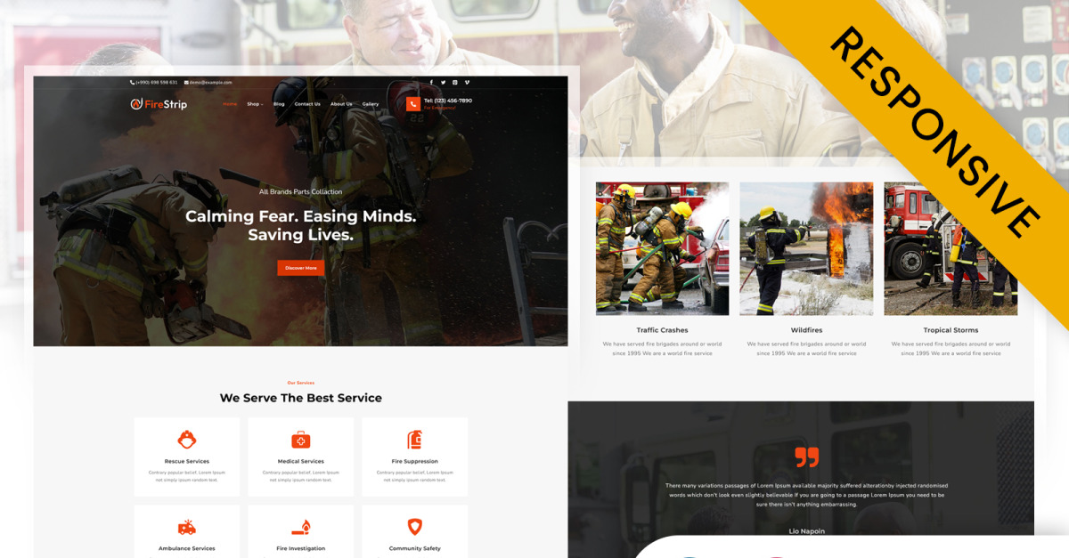 Firestrip - Fire Department WordPress Theme ist ein modernes und elegantes professionelles Theme mit mehreren Funktionen zum Erstellen einer Brandschutz- und Sicherheitswebsite. Wir haben eine Homepage entwickelt, auf der Sie unter anderem Ihre Dienstleistungen, Ihr Unternehmen, Ihre Galerie, Ihre Arbeit, Ihren Anrufbereich, den neuesten Blog, das Team der besten Offiziere, Betriebsvideos und häufig gestellte Fragen präsentieren können. Das Designpaket enthält Beispieldaten, sodass Sie nach der Installation und Aktivierung des Firestrip-Designs in Ihrem Geschäft schnell Demodaten aus dem Admin-Bereich importieren können.