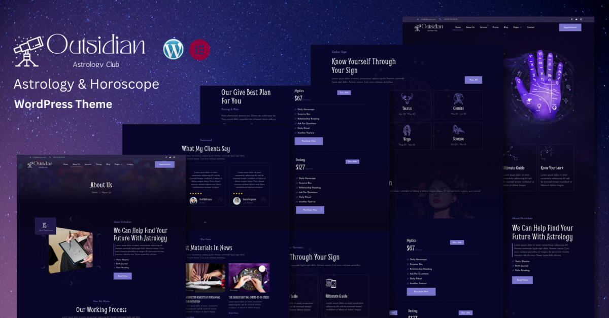 Outsidian, ein fesselndes WordPress-Theme, das speziell auf Astrologie- und Horoskop-Enthusiasten zugeschnitten ist, verbindet Ästhetik nahtlos mit Funktionalität und bietet Benutzern, die den Kosmos erkunden möchten, ein immersives Erlebnis. Dieses mit Präzision und Finesse entwickelte Thema nutzt die Leistungsfähigkeit des beliebten Elementor-Seitenerstellers und bietet eine intuitive und anpassbare Plattform für die Erstellung beeindruckender astrologischer Websites. Die Designelemente von Outsidian sind sorgfältig zusammengestellt, um die mystische und himmlische Natur der Astrologie widerzuspiegeln, mit kosmischen Farbschemata, eleganter Typografie und aufwendigen Grafiken. Mit der Drag-and-Drop-Oberfläche von Elementor können Benutzer ihre Websites mühelos personalisieren, Elemente neu anordnen, Widgets hinzufügen und einzigartige Layouts erstellen.