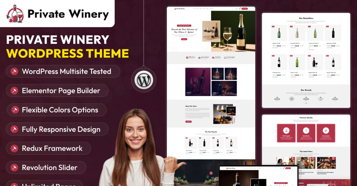 Das Private Winery WordPress Theme ist eine wunderschön gestaltete Lösung für Weingüter, Weinberge, Weinkeller und weinbezogene Unternehmen, die eine starke Online-Präsenz aufbauen möchten. Dieses Theme wurde mit Blick auf Eleganz und Funktionalität entworfen und bietet ein optisch beeindruckendes Layout, das den Charme und die Eleganz Ihres Weinguts unterstreicht. Mit integrierten Funktionen wie einem intuitiven Weinkatalog, einem Eventmanagementsystem und Online-Reservierungsmöglichkeiten bietet es Besuchern ein umfassendes Erlebnis, die Ihre Weinsammlung erkunden, Weinproben buchen oder besondere Veranstaltungen besuchen möchten.