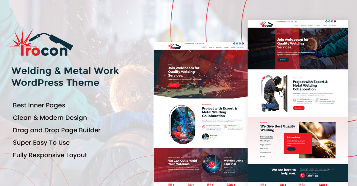 Irocon ist ein spezialisiertes WordPress-Theme für Schweiß-, Metallverarbeitungs- und Industriedienstleistungen. Es bietet Entwicklern, Webdesignern, Unternehmern und Privatpersonen eine leistungsstarke, leicht anpassbare Plattform für einen ansprechenden und professionellen Online-Auftritt. Mit modernem, responsivem Design und maßgeschneiderten Layouts präsentiert Irocon Dienstleistungen, Projekte und Teamkompetenz. Der SEO-optimierte Code, die Kompatibilität mit gängigen Plugins und die hohe Leistung machen es zur idealen Wahl für Unternehmen, die neue Kunden gewinnen möchten. Mit Irocon war es noch nie so einfach, eine wirkungsvolle, funktionale und optisch ansprechende Website für Metall- und Schweißdienstleistungen zu erstellen.
