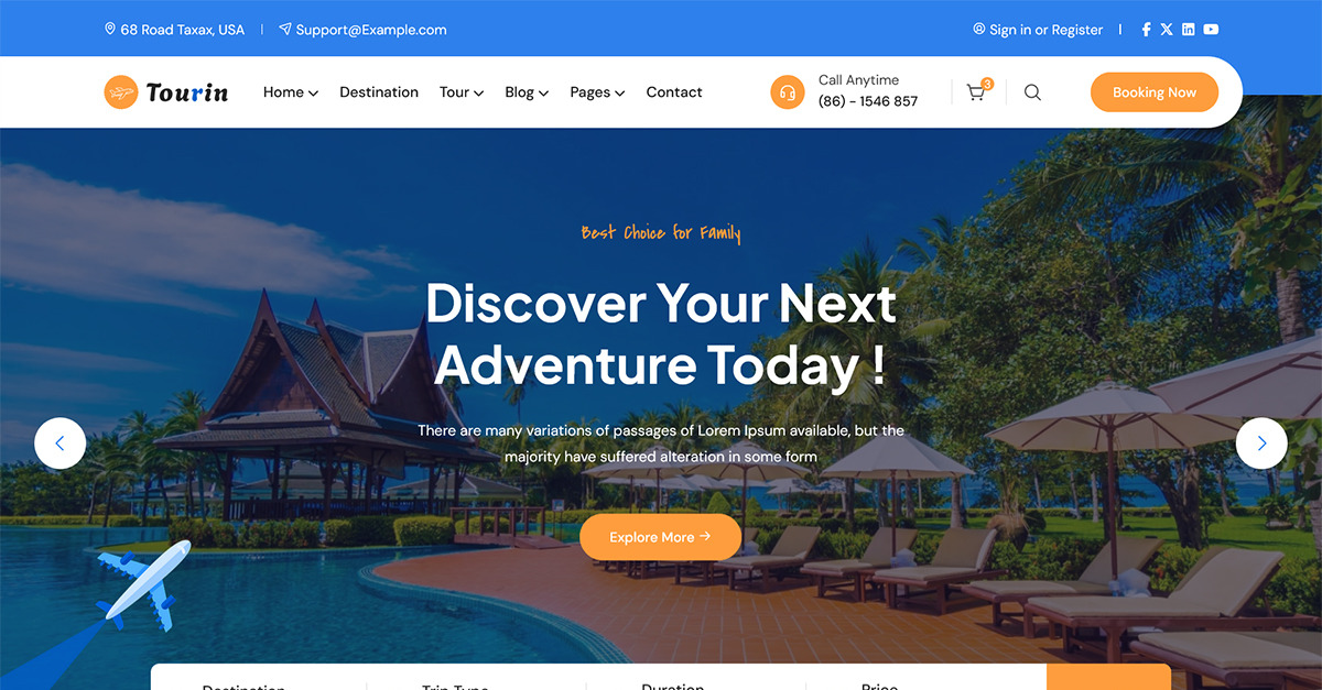 Verwandeln Sie Ihr Reisegeschäft mit dem WordPress-Theme „Tourin Travel Booking“ – der ultimativen Komplettlösung für moderne Reisebüros und -enthusiasten. Mit diesem mit Elementor erstellten Theme können Sie ohne Programmierkenntnisse eine beeindruckende, benutzerfreundliche Website erstellen.