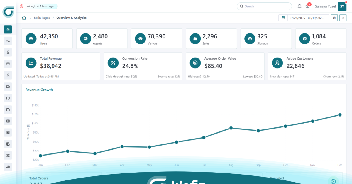 El Panel de Administración de Wafiz es una plantilla moderna y ligera, basada en Bootstrap, diseñada para optimizar las operaciones comerciales con una interfaz clara e intuitiva. Esta versión ligera del panel proporciona todas las herramientas esenciales para gestionar y supervisar las actividades clave con facilidad. Incluye potentes funciones, como Resumen y Análisis, Gestión de Pedidos, Asignación de Tareas, Seguimiento de Inventario, Gestión de Clientes, Entrega y Logística, Informes de Ganancias y Supervisión de Gastos . Perfectamente optimizado para una mayor velocidad y facilidad de uso, Wafiz garantiza una experiencia fluida en todos los dispositivos, lo que lo convierte en la solución ideal para plataformas de comercio electrónico, empresas de logística y aplicaciones empresariales. Ya sea que estés monitorizando el rendimiento, gestionando tareas diarias o analizando métricas de crecimiento, el Panel de Administración de Wafiz te ofrece eficiencia, claridad y control en cada paso.