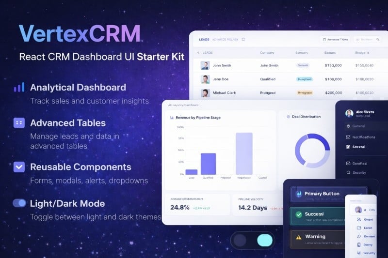 VertexCRM es un moderno kit de inicio de interfaz de usuario CRM basado en React, diseñado para ayudar a los desarrolladores a crear aplicaciones de gestión de clientes escalables y basadas en datos con rapidez y consistencia. Desarrollado con React 18+ y Tailwind CSS, VertexCRM proporciona una base sólida para sistemas CRM, paneles de control SaaS, paneles de administración y herramientas empresariales.