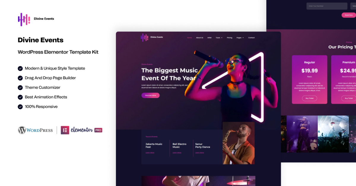 Divine Events - Kit de plantillas Elementor de WordPress listas para usar para eventos musicales