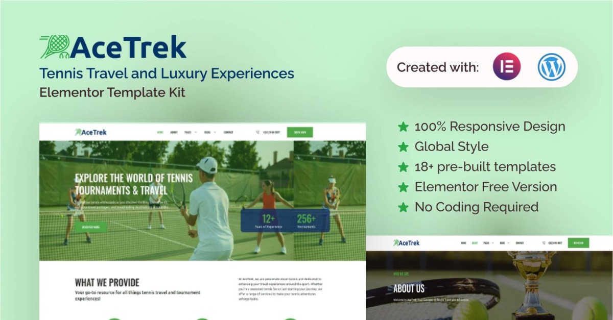 Acetrek - Kit de plantillas Elementor para viajes de tenis y experiencias de lujo