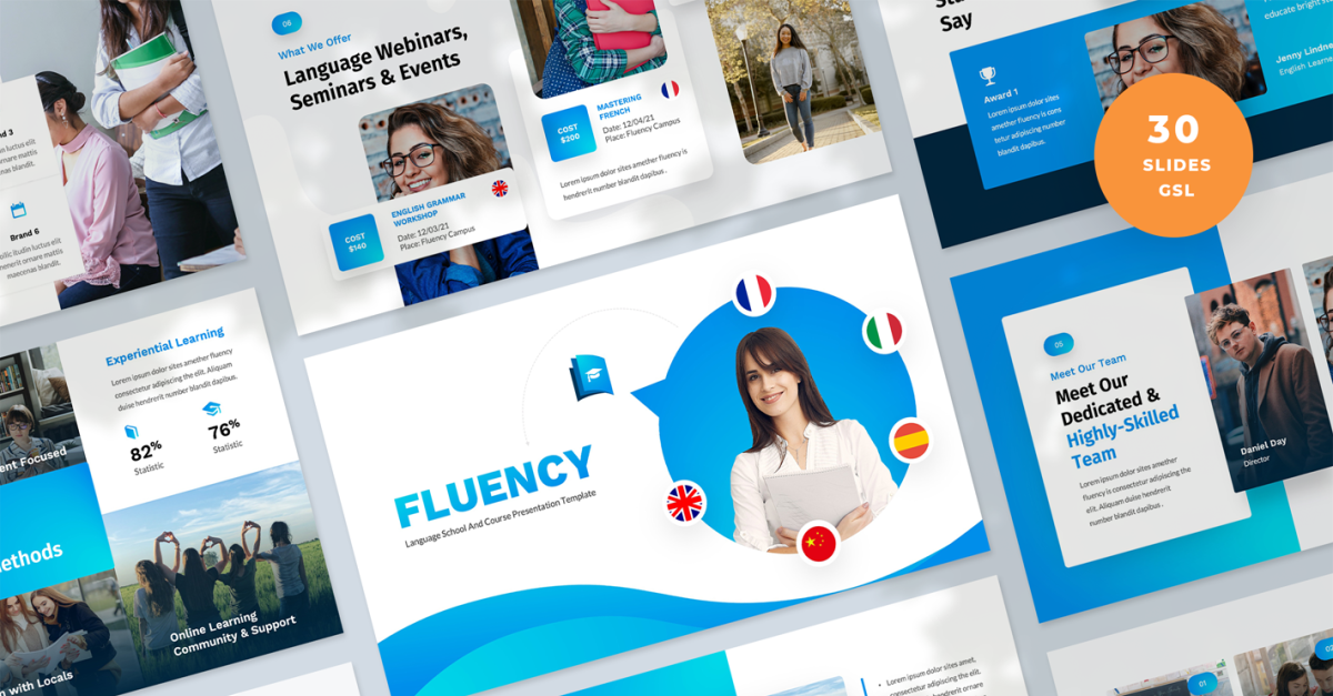 Al crear la Plantilla de presentación de fluidez, nuestro enfoque principal se centró en las empresas y las personas que trabajan en la industria de las escuelas de idiomas. Podrían ofrecer lecciones de idiomas internacionales en un salón de clases, a través de un curso o incluso una aplicación de idiomas. Ya sea que esté haciendo una oferta para un nuevo cliente importante o una cartera comercial, esta plantilla de Presentaciones de Google le permitirá convertir su información y datos en una presentación de manera rápida y eficiente.