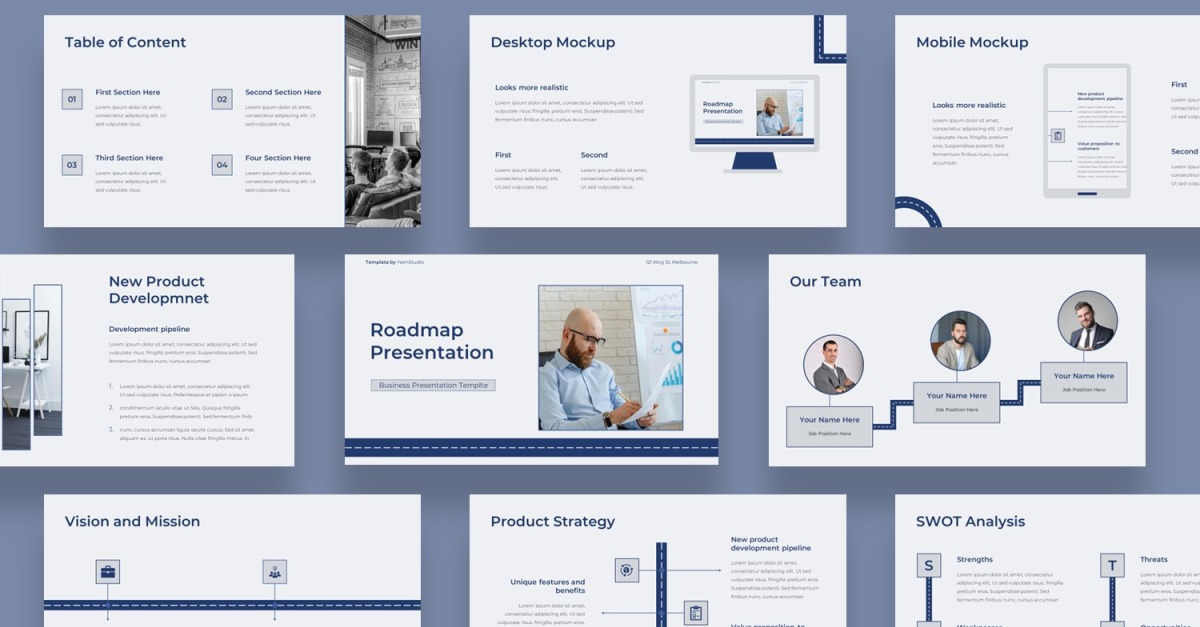 - Diseño profesional: diseños limpios y modernos para mostrar la hoja de ruta de su negocio de manera efectiva