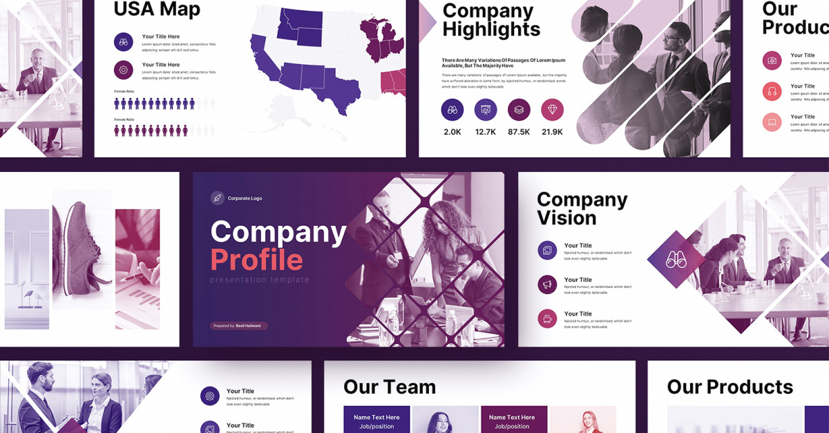 Un perfil de empresa es una introducción escrita a una empresa que destaca su misión, objetivos, fortalezas y productos o servicios. Este documento esencial se puede utilizar para diversos fines, como atraer financiación de posibles inversores, crear una imagen de marca y reclutar talentos. Esta plantilla de presentación tiene todos los temas más necesarios listos para usar.