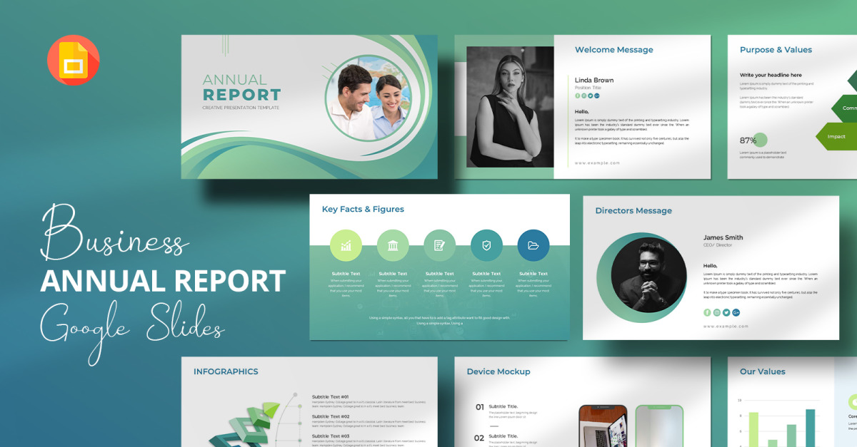 Plantilla moderna de informe anual de Google Slides: presentaciones empresariales y financieras