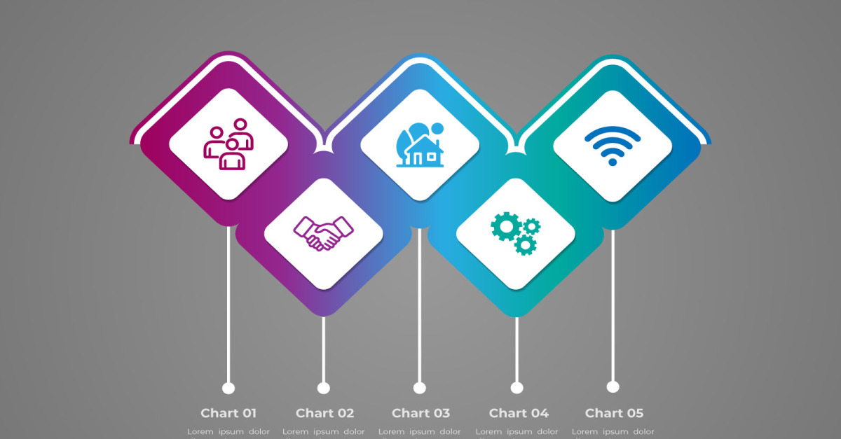 Diseño de gráfico de información vectorial de 5 pasos de estilo cuadrado.