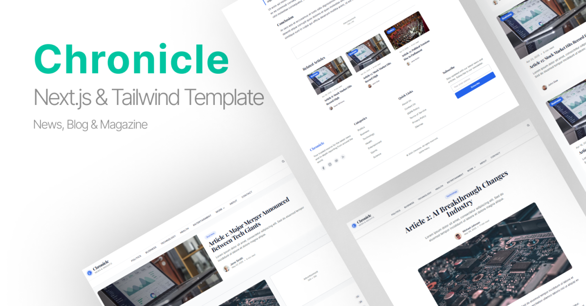 Chronicle capta la atención con su diseño limpio y adaptable. Desarrollado con Tailwind CSS, ofrece flexibilidad de estilo, a la vez que garantiza tiempos de carga rápidos y un rendimiento óptimo en todos los dispositivos. Desde grandes titulares que llaman la atención hasta elementos visuales cuidadosamente ubicados que complementan el texto, cada elemento de diseño contribuye a mejorar la experiencia de lectura.