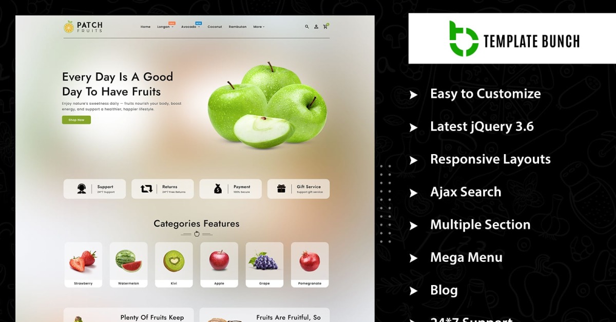 Patch Fruits - Tema Responsive de Shopify para eCommerce es un tema fresco, dinámico y de alto rendimiento, especialmente diseñado para tiendas de productos orgánicos, fruterías, supermercados y vendedores de productos frescos de granja. Con su diseño colorido y limpio, Patch Fruits le da a tu tienda un atractivo atractivo que capta la atención del cliente al instante. Desarrollado con Bootstrap, ofrece un diseño 100% responsivo, lo que garantiza un rendimiento fluido en todos los tamaños de pantalla y dispositivos.