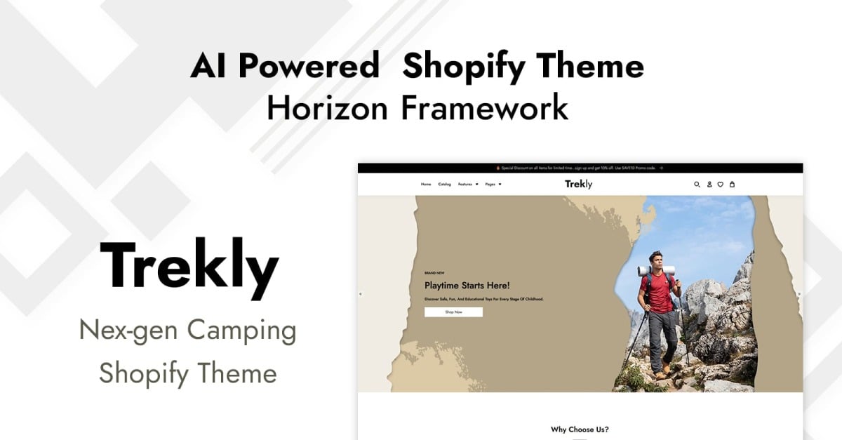 Trekly es un tema de Shopify de última generación, diseñado exclusivamente para tiendas de camping, tiendas de equipo de trekking, marcas de aventuras al aire libre y minoristas de equipos de supervivencia . Impulsado por AI Horizon Framework , Trekly combina un rendimiento ultrarrápido, un diseño robusto y elegante, y personalización basada en IA para impulsar tu negocio de actividades al aire libre.