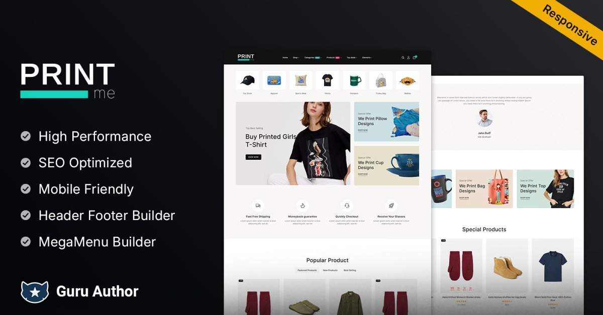 Printme - WooCommerce Elementor Theme es excelente para cualquier sitio de comercio electrónico, pero es especialmente bueno para aquellos que venden servicios de impresión, camisetas, ropa y otros productos que desean crear un hermoso sitio web para mostrar su fantástico contenido. La tienda de printme presenta diseños versátiles y creativos que están diseñados para responder completamente en una variedad de dispositivos. También incluye un diseño de sitio web integral que puede modificar para satisfacer sus necesidades o las demandas de sus clientes. El tema es apropiado para cualquier tipo de empresa de comercio electrónico, incluida la moda. Además, una tonelada de funciones útiles, como Menú móvil, Retina Ready, Fuentes de Google, Blog de la página de inicio, Carrusel de productos, Búsqueda de Ajax y mucho más, estarán disponibles para que construyas tus sitios web. Pruebe este fantástico tema cuando inicie su tienda en línea. Ha llegado el momento de exhibir todos los artículos de impresión en su sitio web en un esfuerzo por atraer a más clientes potenciales.