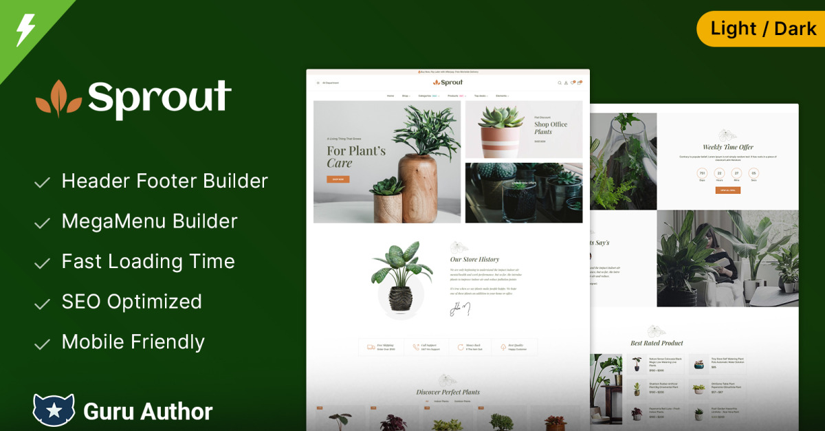 Sprout es un tema WooCommerce con un diseño atractivo, pensado para viveros, tiendas de jardinería y floristerías. Ofrece un diseño limpio, moderno y totalmente responsivo, garantizando una experiencia de compra fluida para los apasionados de las plantas, el paisajismo y la decoración floral.